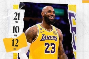 赛后,湖人官方发布詹姆斯三双数据海报。