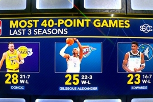 近3个赛季40+场次排名前三:东契奇28场 SGA25场 华子23场