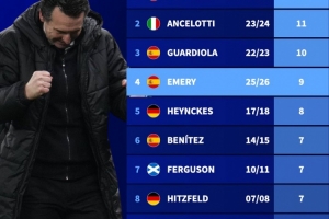 新世纪以来主帅欧战半决赛次数榜:埃梅里9次,仅次瓜穆、安帅3人