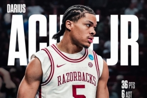 体育资讯3月22日讯 NCAA疯三32强赛,阿肯色大学94-88险胜海波特大学,晋级甜蜜16强。