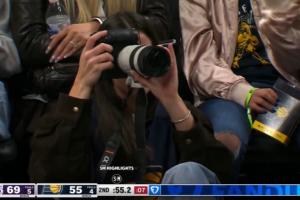 体育资讯3月26日讯 NBA常规赛,步行者对阵湖人,克拉克客串场边的摄影师。